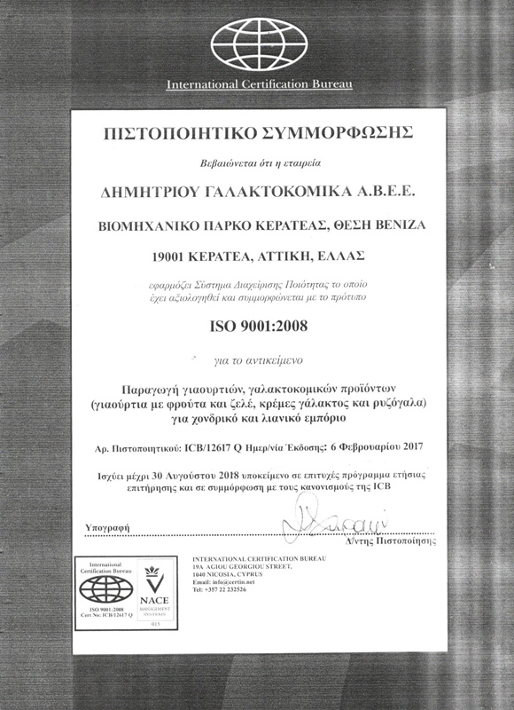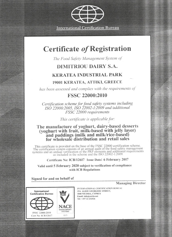 Η εταιρεία μας έχει πιστοποιηθεί για το σύστημα Διαχείρισης Ασφάλειας Τροφίμων σύμφωνα με το πρότυπο ISO 22000:2005 και FSSC 22000:2010 που βασίζονται στις αρχές του HACCP, για όλες τις γραμμές παραγωγής έτσι ώστε να διασφαλίζεται πλήρως η υγιεινή, η ασφάλεια και η ποιότητα των προϊόντων μας.
